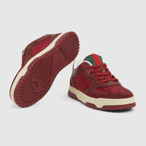 O Gucci Re‑Web é um tênis de silhueta clean que destaca a icônica faixa Web da Gucci de forma ousada — posicionada na lingueta central (“tongue”) como elemento de destaque. Ele combina materiais tradicionais como a tela Original GG canvas com acabamentos em couro ou camurça, dependendo da versão, resultando em um visual sofisticado e atemporal