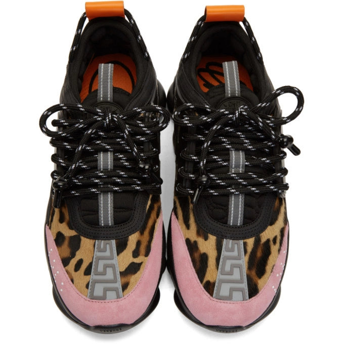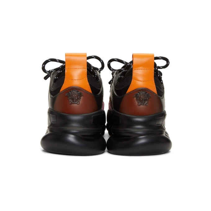 Versace Chain Reaction – Sneaker icônico com solado em formato de corrente, cabedal em materiais mistos (mesh, couro, camurça, TPU), com detalhes exclusivos como Greca, Braille "Love", logo Medusa e branding. Lançado em 2018, virou referência no streetwear de luxo graças ao visual escultural e às colaborações de alto impacto. Confortável, oferece bom amortecimento e estilo audacioso — ideal para quem busca exclusividade.